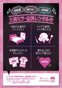 2026年1月28日 / 最終更新日 : 2026年1月28日 ホテル ジパゴ 新着情報 2月より大型ミラー無料レンタル開始!! ※お貸出しできないお部屋もございます。 あらかじめご了承くださいませ。 詳しくはフロントまでご連絡くださいませ。